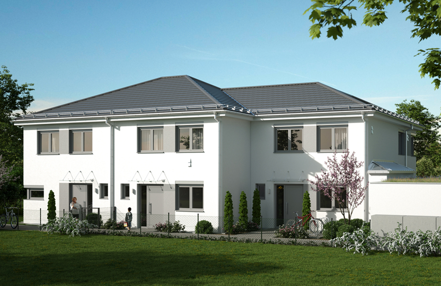 Unser architektonisches Konzept leitet sich zum einen aus den Vorgaben des Bebauungsplanes ab, zum anderen aus unserem Anspruch, Ihnen eine zeitlose, moderne Architektur zu bieten. Details wie die Ausführung als Walmdach im Zusammenspiel mit der Dacheindeckung mit einem Dachstein mit klarem geometrischem Deckbild und Linienführung zeichnen das gehobene Erscheinungsbild aus. Jedes Haus hat seine eigene Form und es entsteht nicht der Charakter eines gewöhnlichen Dreispänners. Die Einzelgaragen und Stellplätze runden das Angebot ab.