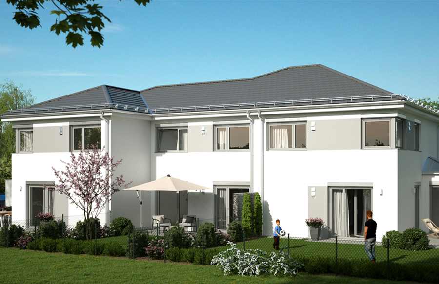 Unser architektonisches Konzept leitet sich zum einen aus den Vorgaben des Bebauungsplanes ab, zum anderen aus unserem Anspruch, Ihnen eine zeitlose, moderne Architektur zu bieten. Details wie die Ausführung als Walmdach im Zusammenspiel mit der Dacheindeckung mit einem Dachstein mit klarem geometrischem Deckbild und Linienführung zeichnen das gehobene Erscheinungsbild aus. Jedes Haus hat seine eigene Form und es entsteht nicht der Charakter eines gewöhnlichen Dreispänners. Die Einzelgaragen und Stellplätze runden das Angebot ab.