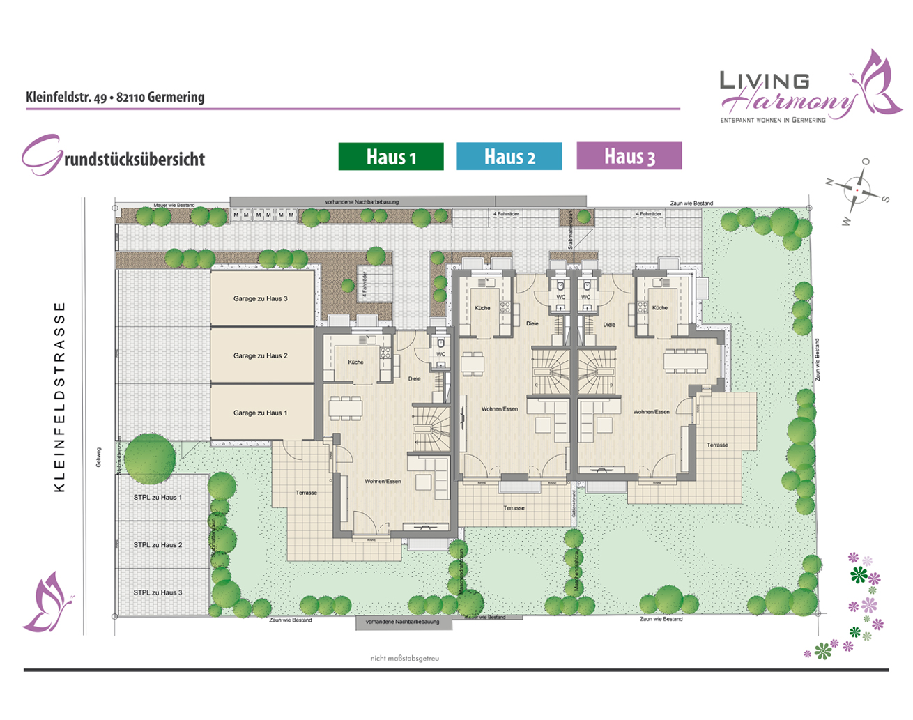 Auf dem ca. 784 m² großen Grundstück in Germering errichten wir ab Herbst 2020 einen modernen Dreispänner – real geteilt – mit je 1 Garage und 1 offenen Stellplatz. Die Fertigstellung wird garantiert für Ende März 2022.